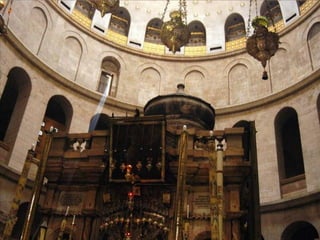 El documento describe varios lugares sagrados en Jerusalén relacionados con las tres principales religiones monoteístas. Incluye la Cúpula de la Roca, un importante santuario islámico; el Muro de las Lamentaciones, un sitio sagrado para los judíos; y la Basílica del Santo Sepulcro, el lugar más sagrado del cristianismo donde según la tradición Jesús fue crucificado y resucitado.