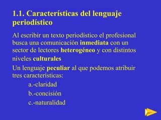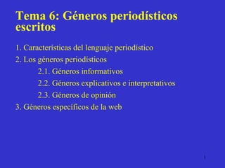 El documento describe los diferentes géneros periodísticos escritos, dividiéndolos en tres categorías principales: géneros informativos, géneros explicativos e interpretativos, y géneros de opinión. Dentro de los géneros informativos, destaca la noticia. Los géneros explicativos e interpretativos incluyen el informe, el reportaje descriptivo y la crónica. Finalmente, entre los géneros de opinión se encuentran el editorial y la columna.