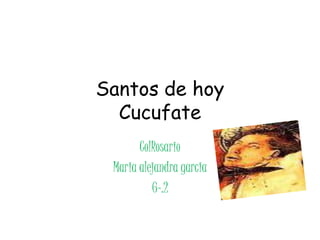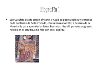 El documento presenta información sobre la vida y martirio de San Cucufate. Nació en el norte de África en el siglo III y fue martirizado en España. Realizó milagros como sanar sus heridas y apagar las llamas de una hoguera. Sus reliquias fueron trasladadas a varios lugares de Francia e Italia y actualmente se encuentran en la iglesia que lleva su nombre en San Cugat del Vallés, España.