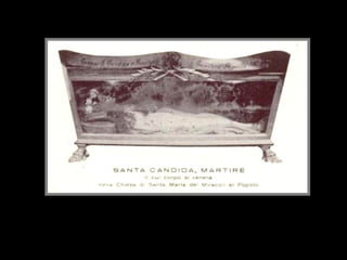 Este documento describe varios casos de santos cuyos cuerpos se han preservado de la descomposición natural (incorruptibilidad) después de su muerte, a veces durante cientos de años, lo cual se considera un don sobrenatural dado por Dios para fortalecer la fe. Algunos de estos cuerpos también han exhibido otros fenómenos como la emanación de aceites aromáticos o la aparición de sangre fresca, lo cual desafía las explicaciones científicas. El documento proporciona muchos ejemplos específicos de
