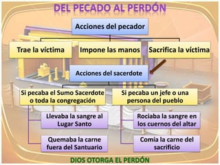 El documento describe los procedimientos del sacrificio en el antiguo Israel para el perdón de pecados. Había tres tipos de pecado que requerían diferentes sacrificios. El pecador debía traer una víctima, imponer sus manos sobre ella para transferir la culpa, y luego matarla. El sacerdote usaba la sangre de la víctima para limpiar al pecador. Jesús cargó con todos los pecados a través de su sacrificio en la cruz para proveer perdón completo.