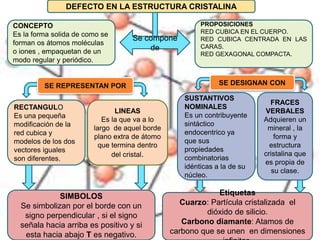 Este documento habla sobre los defectos en la estructura cristalina. Explica que un defecto en la estructura cristalina se refiere a la forma en que los átomos, moléculas o iones se empaquetan de manera regular y periódica en un sólido. Describe brevemente algunos tipos de defectos como líneas y bordes, y cómo se simbolizan y representan. El documento fue escrito por Jesuanny Godoy para un curso de Tecnología de Materiales.