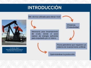 Este documento describe los métodos operacionales para unidades de bombeo mecánico convencionales, incluyendo el cálculo de la longitud de recorrido del pistón, el desplazamiento del pistón, y la carga sobre la barra lisa. También discute el efecto de contrabalance y los tipos de motores utilizados para impulsar las bombas, así como las ventajas y desventajas de los sistemas de bombeo mecánico.