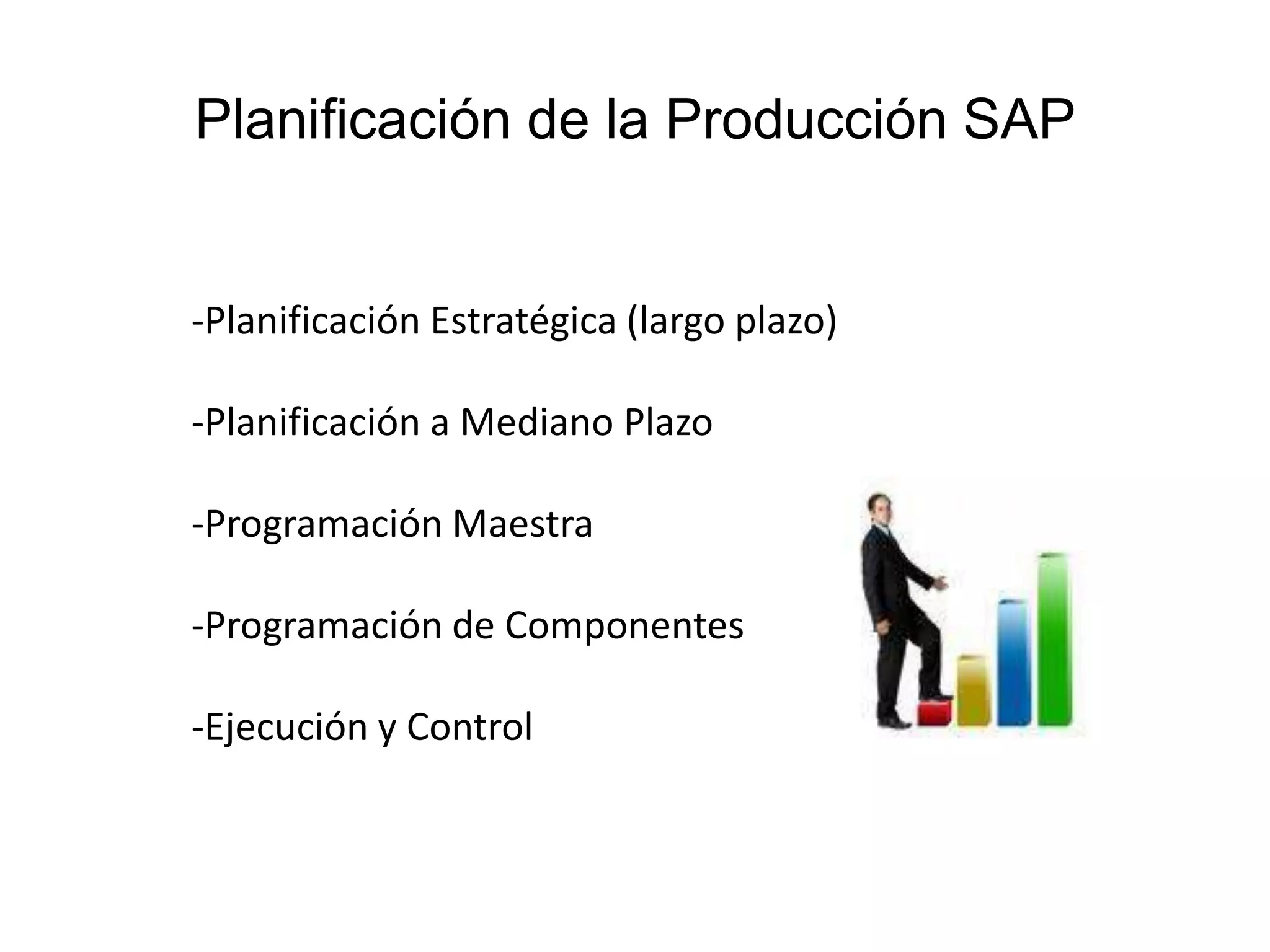 La planificación de la producción en SAP incluye varias etapas: la planificación estratégica a largo plazo, la planificación a mediano plazo, la programación maestra, la programación de componentes y la ejecución y control. El objetivo general es lograr los objetivos de producción determinando cuánto y cuándo producir, cuánto y cuándo pedir materias primas, y asegurando que la unidad de producción esté preparada para producir las cantidades planeadas en los momentos previstos, tomando en