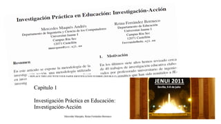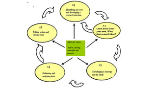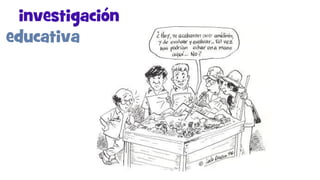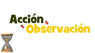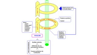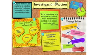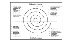 La investigación-acción es una indagación práctica realizada de forma colaborativa por el profesorado con el objetivo de mejorar su práctica docente a través de ciclos de acción y reflexión. Implica identificar un problema, planificar acciones para abordarlo, observar los resultados y reflexionar sobre ellos.