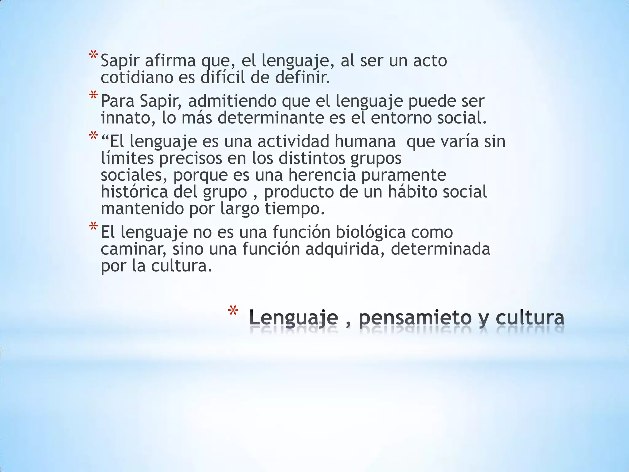 El documento resume las teorías lingüísticas de Edward Sapir y otros estructuralistas americanos del siglo XX. Sapir sostiene que el lenguaje es determinado por la cultura y el entorno social más que por factores biológicos. También explora las relaciones entre lenguaje y pensamiento.