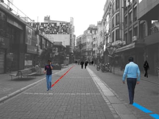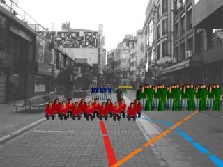 Un grupo de estudiantes realizó una acción performática en el paseo peatonal Sarandí en Montevideo como parte de un seminario universitario. Configuraron obstáculos humanos móviles que cambiaban de forma y tamaño de manera organizada, transformando el espacio público en una ficción de videojuego para desestabilizar a los peatones y obtener una reacción. La acción buscaba tensionar a la sociedad cada vez más alienada en los espacios públicos.