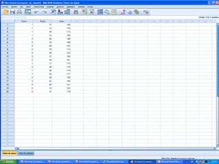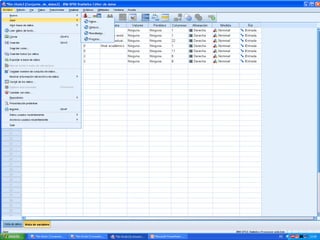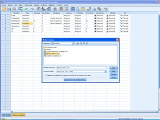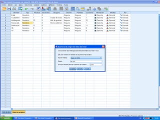 Este documento proporciona instrucciones para importar una hoja de Excel a IBM SPSS sin incluir ciertas columnas (A y E) y solo los primeros 20 casos. Explica que hay que abrir el archivo de Excel, seleccionar la hoja 1, establecer el rango como B1:D21 para excluir las columnas A y E, y guardar el archivo resultante en formato SPSS.