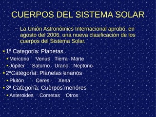 El documento clasifica los cuerpos del sistema solar en 3 categorías: planetas, planetas enanos y cuerpos menores. Describe brevemente las características de los 8 planetas principales, incluyendo sus distancias al sol y períodos de revolución, así como los 3 planetas enanos actualmente reconocidos: Plutón, Eris y Ceres.
