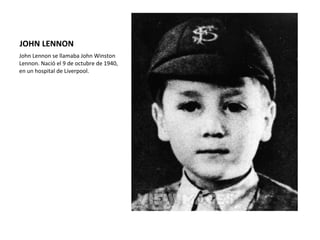 John Lennon nació en Liverpool en 1940 y formó la banda The Beatles, luego inició una carrera como solista donde su canción más conocida fue Imagine. Se casó dos veces y tuvo dos hijos, pero fue asesinado a tiros frente a su casa en Nueva York en 1980 a la edad de 40 años.