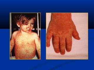 El sarampión es una enfermedad altamente infecciosa causada por un virus del género Morbillivirus. Se caracteriza por fiebre, tos, erupción cutánea y manchas de Koplik. Se transmite por gotitas de saliva y su prevención requiere vacunación. Puede causar complicaciones como neumonía, encefalitis y panencefalitis esclerosante subaguda. No tiene tratamiento específico más allá de medidas de soporte.