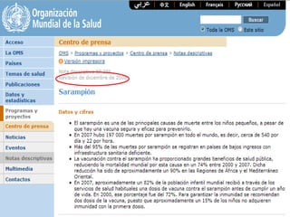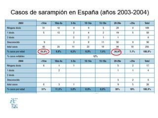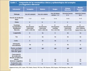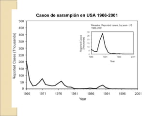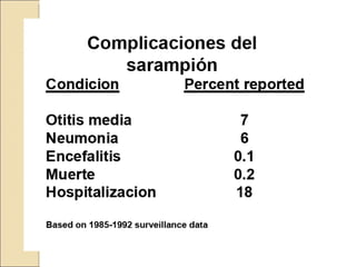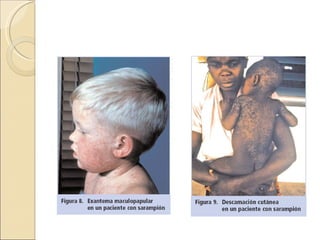 El documento resume las características del sarampión, incluyendo su etiología, epidemiología, manifestaciones clínicas, complicaciones, diagnóstico, tratamiento, vacuna y medidas de control. El sarampión es causado por un virus RNA que se transmite por gotas respiratorias y su incidencia es mayor en invierno-primavera. Los síntomas incluyen fiebre, exantema y puede complicarse con neumonía. Se diagnostica clínica o serológicamente y se previene mediante dos dosis de vacuna triple ví