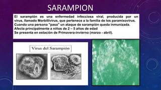 El sarampión es una enfermedad viral altamente contagiosa que se transmite por el aire y afecta principalmente a niños. Presenta cuatro fases: incubación, prodrómica con síntomas como fiebre y tos, eruptiva con erupción cutánea, y convalecencia. No tiene tratamiento específico, solo alivio de síntomas, por lo que la prevención a través de la vacuna doble es fundamental.