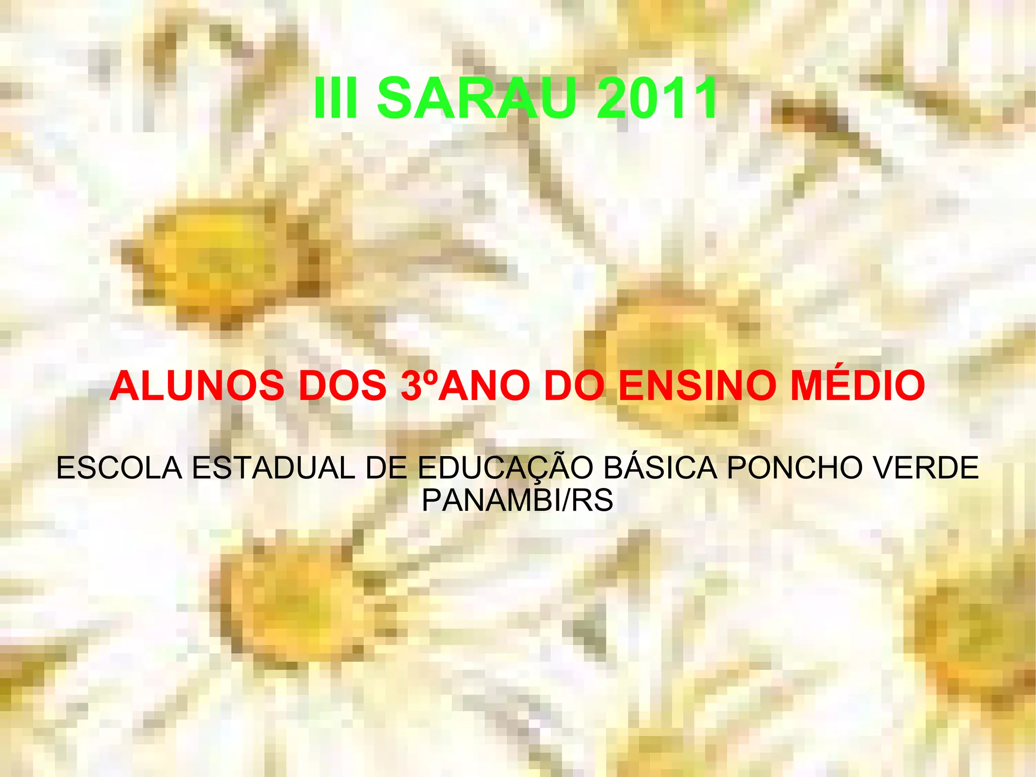 El documento lista los nombres de estudiantes de tercer año de la Escuela Estatal de Educación Básica Poncho Verde en Panambi, Brasil que participaron en el III Sarau 2011. Los nombres están agrupados por clase, con Daniel en la clase 302, Jonathan y Bianca en la clase 303, y Fernando, Júlia, Juliana y Karine en la clase 301. También se mencionan Lucas, Fábio y Vicente, así como Maiara de la clase 301. El documento concluye con las clases 303.