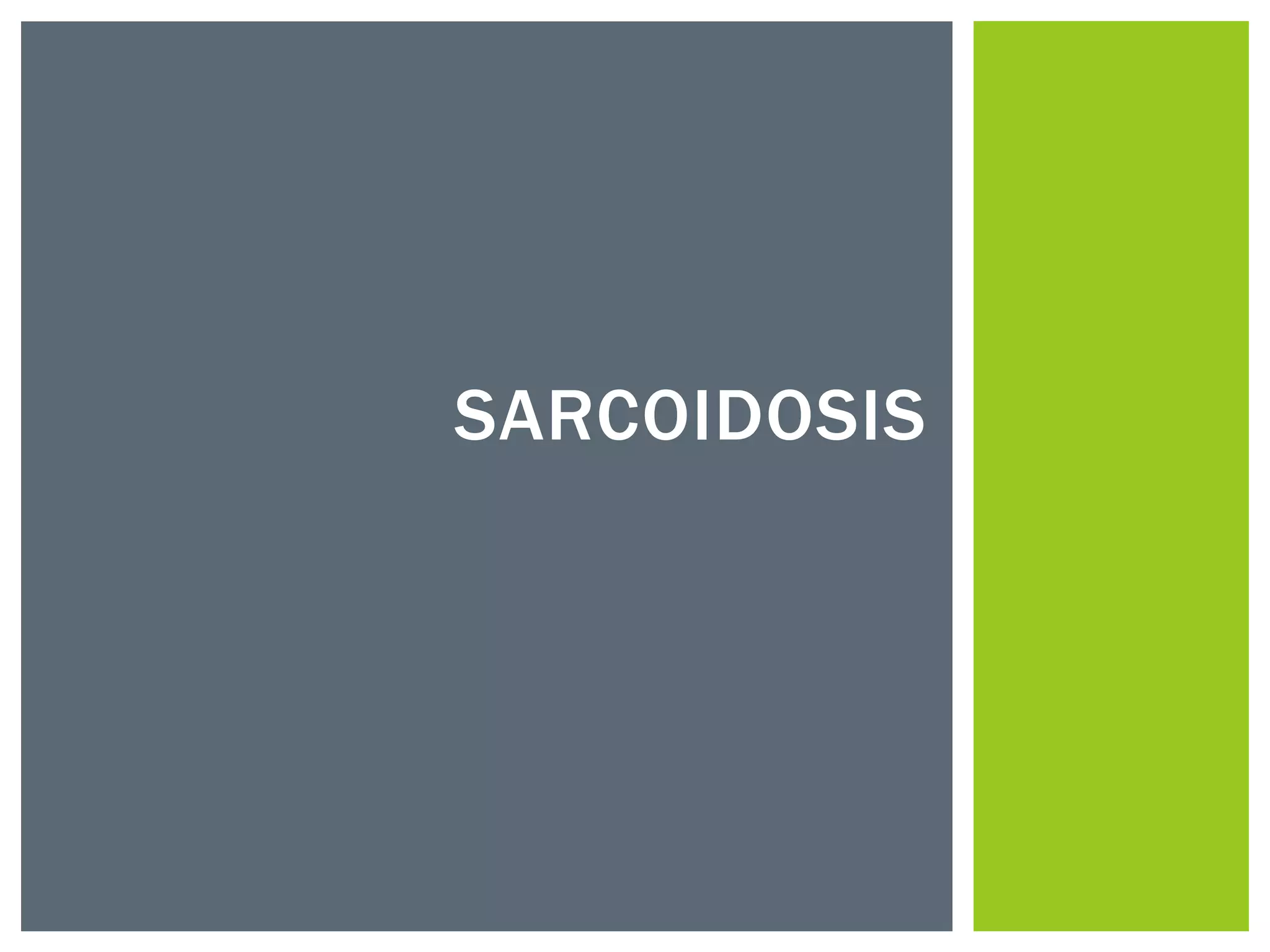 La sarcoidosis es un trastorno multisistémico de etiología desconocida que se caracteriza por la formación de granulomas no caseosos. Afecta principalmente los pulmones y ganglios linfáticos, aunque puede afectar otros órganos. Su diagnóstico se basa en hallazgos histológicos, radiológicos y de exclusión de otras enfermedades. Su pronóstico es variable pero generalmente bueno, aunque en algunos casos puede progresar a insuficiencia respiratoria. El tratamiento incl
