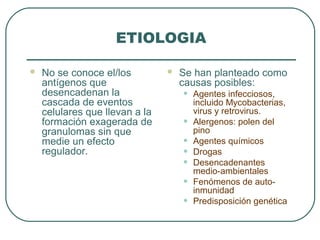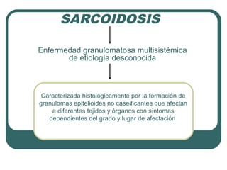 La sarcoidosis es una enfermedad granulomatosa de etiología desconocida caracterizada por la formación de granulomas no caseificantes en múltiples órganos. Sus síntomas pueden incluir fatiga, dolores articulares, lesiones cutáneas, sequedad ocular, tos seca y pérdida de peso. Aunque a menudo es asintomática, se manifiesta frecuentemente con adenopatía hiliar bilateral e infiltración pulmonar. Su diagnóstico requiere hallazgos clínicos, radi