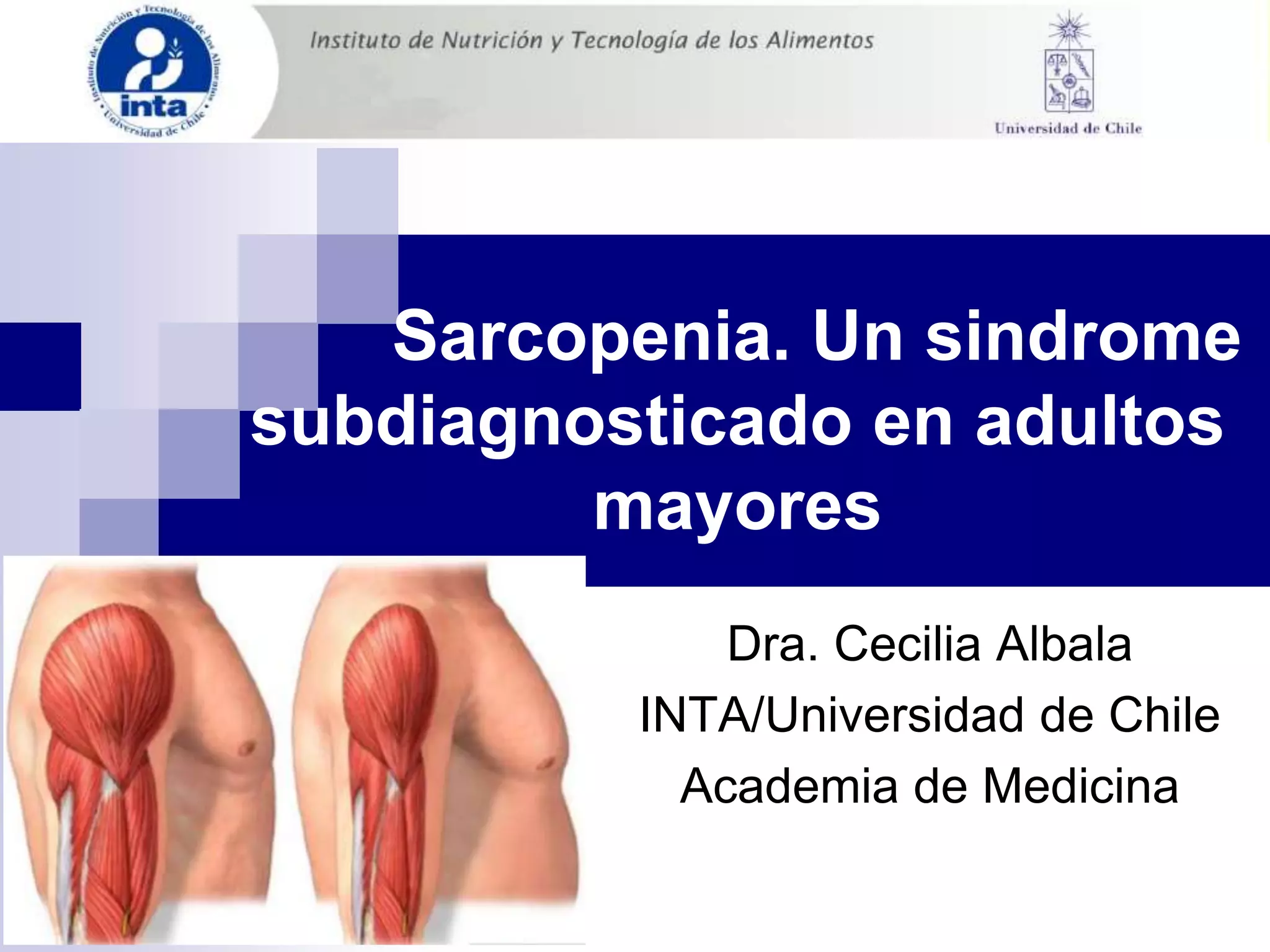 La sarcopenia es un síndrome caracterizado por la pérdida de masa muscular asociada al envejecimiento. Afecta a entre un 5-13% de personas entre 60-70 años y hasta un 50% de personas mayores de 80 años. Sus principales consecuencias son limitaciones funcionales, mayor riesgo de caídas, fracturas y discapacidad. Se puede prevenir y tratar a través del ejercicio de resistencia y una dieta adecuada rica en proteínas y vitamina D.