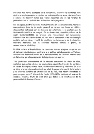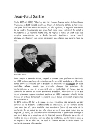 Jean-Paul Sartre fue un filósofo y escritor francés influyente del siglo XX. Estudió en la École Normale Supérieure donde conoció a Simone de Beauvoir con quien mantuvo una relación de por vida. Publicó obras filosóficas como La náusea y El ser y la nada que ayudaron a difundir las ideas del existencialismo. También fundó la revista Les Temps Modernes para difundir ideas de izquierda en la posguerra. Participó activamente en movimientos políticos y estudiantiles de izquierda