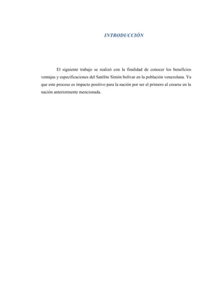 El documento describe el Satélite Simón Bolívar, el primer satélite de Venezuela. Fue lanzado desde China en 2008 con un costo de $406 millones. Proporciona servicios de telecomunicaciones a Venezuela y partes de América Latina. El satélite fue diseñado y construido en China y es controlado desde estaciones en Venezuela. Tiene el objetivo de brindar acceso a internet, telefonía, televisión y telemedicina a Venezuela, especialmente a áreas remotas.