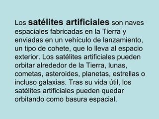 Los satélites artificiales son naves espaciales fabricadas en la Tierra y enviadas al espacio exterior utilizando cohetes. Pueden orbitar diferentes objetos celestes como la Tierra, lunas o planetas. Existen varios tipos de satélites como los de comunicaciones, observación, navegación, meteorológicos y reconocimiento.