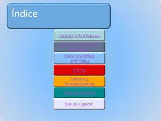 El documento detalla la historia y la evolución de los satélites artificiales, comenzando con el lanzamiento del Sputnik 1 en 1957 y la posterior creación de numerosos satélites en diversas órbitas. Se aborda la física detrás de su funcionamiento, tipos de órbitas, y el problema creciente de la basura espacial, así como las soluciones propuestas para mitigar este desafío. Además, se mencionan diferentes tipos de satélites y sus aplicaciones en campos como comunicaciones, meteorología e investigación espacial.