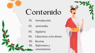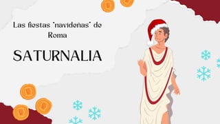 El documento resume las fiestas de Saturnalia y Sigillaria de la antigua Roma. Saturnalia era una fiesta pagana que se celebraba del 17 al 23 de diciembre en honor a Saturno. Durante esta semana, las actividades normales se suspendían y los roles sociales se invertían, permitiendo a los esclavos mayor libertad. Sigillaria era un festival asociado con los niños que involucraba el intercambio de figurillas de arcilla y velas como regalos.