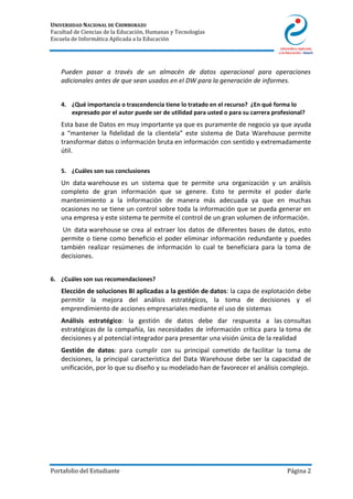 Un data warehouse es un sistema que permite almacenar y analizar grandes cantidades de datos históricos de una organización de manera integrada con el objetivo de obtener información estratégica y táctica que ayude en la toma de decisiones. Los datos se extraen de diferentes bases de datos operacionales y almacenan en el data warehouse luego de pasar por procesos de transformación y limpieza para eliminar redundancias y facilitar el análisis.