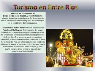 El documento presenta información sobre el turismo en Entre Ríos, Argentina, incluyendo las Termas de Chajarí y playas en los ríos Paraná, Gualeguay y Uruguay. También describe el fitoplancton oceánico, su importancia en la cadena alimenticia marina y su ciclo. Además, alerta sobre un posible "tsunami solar" que podría afectar los sistemas eléctricos y de telecomunicaciones, y analiza los impactos ambientales de las energías sucias como la nuclear y los combustibles fósiles.