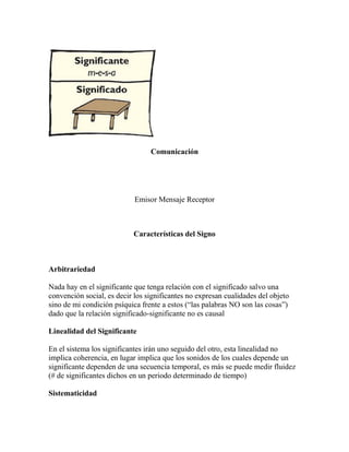 Saussure propuso que el lenguaje se compone de dos partes: la lengua y el habla. La lengua es el sistema social de signos que comprende una comunidad lingüística, mientras que el habla es el uso individual de ese sistema. El signo lingüístico une un significante (imagen acústica) con un significado (concepto) de forma arbitraria y sistemática. La lingüística estudia las leyes y relaciones dentro de los sistemas de lenguas a través del análisis de sintagmas y paradigmas.