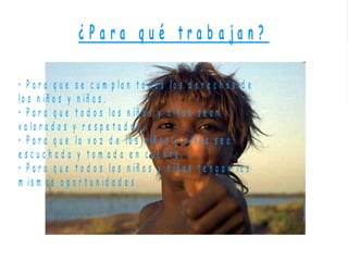 Save the Children es la organización líder a nivel mundial que trabaja a favor de los derechos de la infancia. Fue fundada en 1919 por Eglantyne Jebb para ayudar a los niños refugiados después de la Primera Guerra Mundial. Actualmente opera en 29 países y trabaja directamente con niños, incide en políticas públicas, sensibiliza a la población sobre temas que afectan a los niños, y promueve la participación infantil y la igualdad de oportunidades.