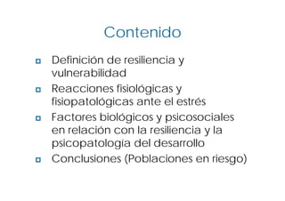 El documento aborda la resiliencia y su relación con la psicopatología en el desarrollo, incluyendo definiciones y factores que influyen en la adaptación ante la adversidad. Analiza aspectos biológicos, psicosociales y neurobiológicos que afectan la resiliencia, así como las implicaciones para poblaciones en riesgo. Se concluye sobre la importancia de entender las interacciones entre genética, ambiente y vulnerabilidad para promover un desarrollo saludable.