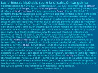 Este documento describe la evolución histórica de la comprensión del sistema circulatorio, desde las primeras teorías de Hipócrates y Aristóteles hasta el descubrimiento correcto de la circulación menor por Miguel Servet en el siglo XVI. Explica que muchos anatomistas como Galeno, Vesalio y otros observaron partes del sistema circulatorio pero no pudieron explicar completamente cómo funciona, hasta que la teoría correcta de la circulación fue finalmente aceptada.