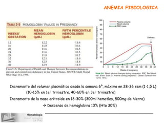 El documento habla sobre las anemias en el embarazo, específicamente sobre la anemia ferropénica y las anemias por déficit de vitamina B12 o fólico. Describe las causas, diagnóstico y tratamiento de estas anemias carenciales comunes durante el embarazo. El tratamiento de la anemia ferropénica incluye suplementos orales de hierro, e intravenosos en casos graves o de mala absorción. Para las anemias por déficit de B12 o fólico, el tratamiento consiste en suplementos