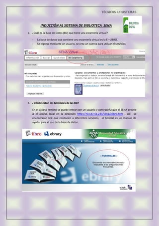 Este documento presenta una inducción sobre el uso de la biblioteca virtual del Sena. Explica que la base de datos con una estantería virtual es E-Libro, donde se pueden encontrar tutoriales y manuales de ayuda. Identifica que la base de datos con logo de un libro es E-Libro. Finalmente, menciona algunos servicios a los que tienen acceso los usuarios como asesoría, consulta de material en sala y acceso a internet.