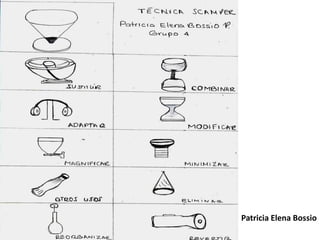La técnica SCAMPER ayuda a generar ideas para resolver problemas mediante la modificación de un producto existente. Se analiza un ejemplo aplicando SCAMPER a una flauta, sugiriendo sustituir materiales, combinar tamaños o adaptarla a nuevos usos. Otro ejemplo aplica SCAMPER a un tenis deportivo, proponiendo protección contra el sudor, suelas intercambiables o agarres ajustables. Finalmente, se analiza una copa sugiriendo cambios de forma, tamaño o función.