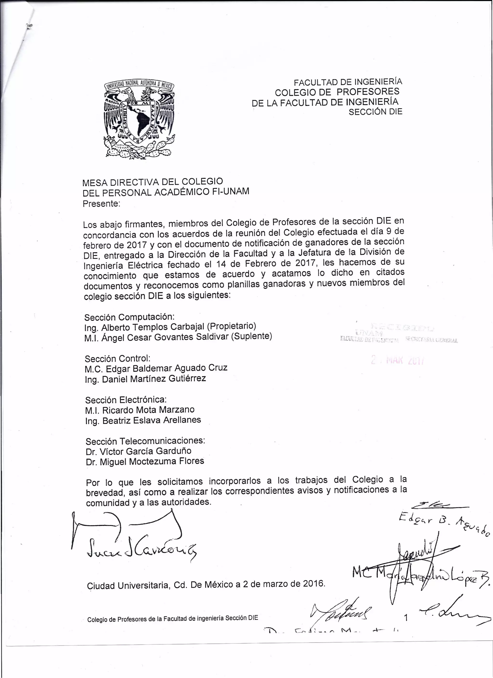 El colegio de profesores de la sección DIE de la Facultad de Ingeniería de la UNAM reconoce a nuevos miembros y planillas ganadoras elegidas en la reunión del 9 de febrero de 2017. Los nuevos miembros incluyen representantes de las secciones de computación, control, electrónica y telecomunicaciones. Se solicita su incorporación inmediata a los trabajos del colegio y la notificación correspondiente.