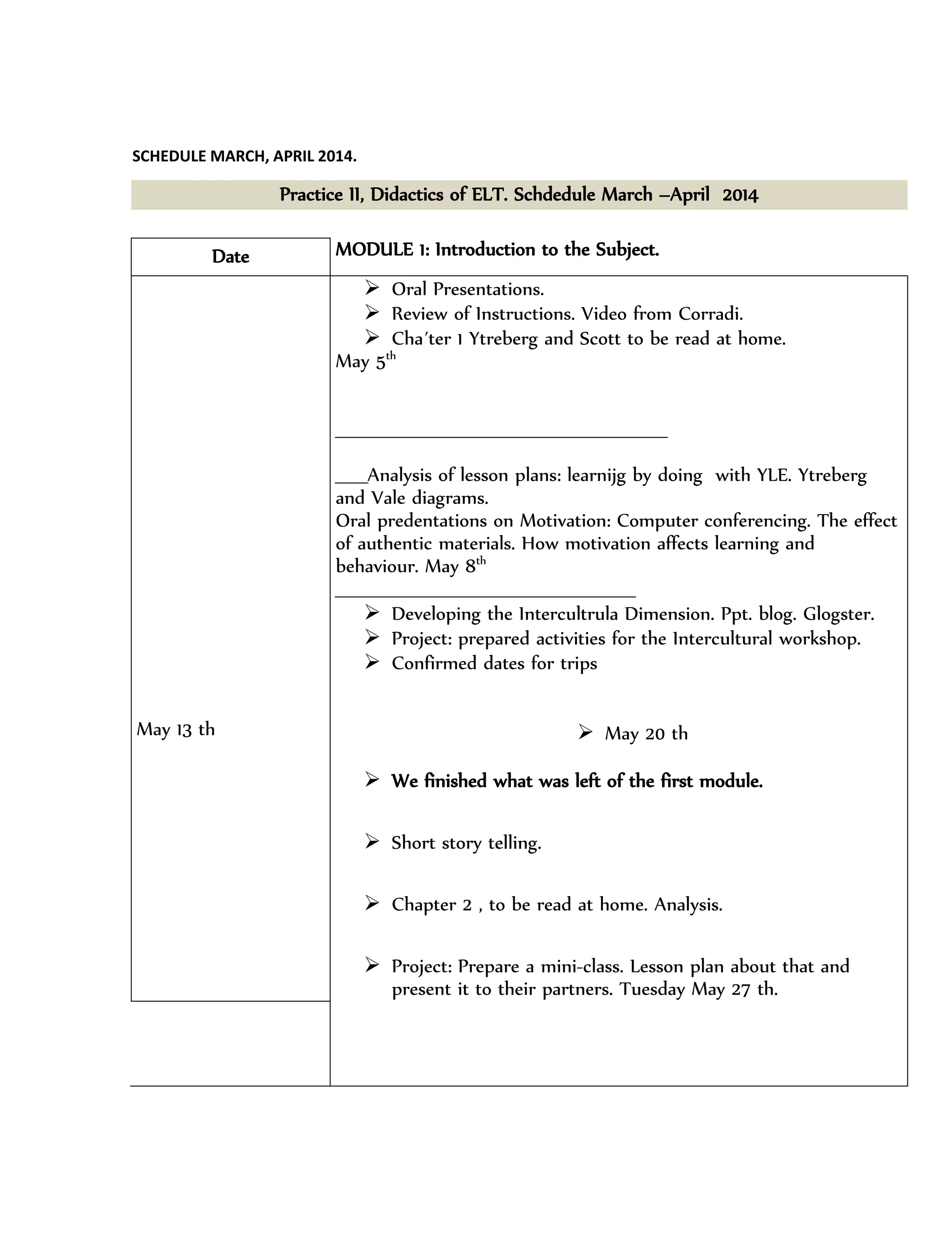 Este documento presenta el cronograma de marzo y abril de 2014 para la asignatura Didáctica de la Enseñanza del Inglés. Incluye las fechas y temas a cubrir divididos en módulos. El primer módulo se centra en la introducción a la asignatura y la planificación de lecciones. Los temas posteriores incluyen la observación de clases, el diseño curricular, el análisis de syllabus y textos, y la planificación de unidades y lecciones. El documento también describe las tareas prácticas como la