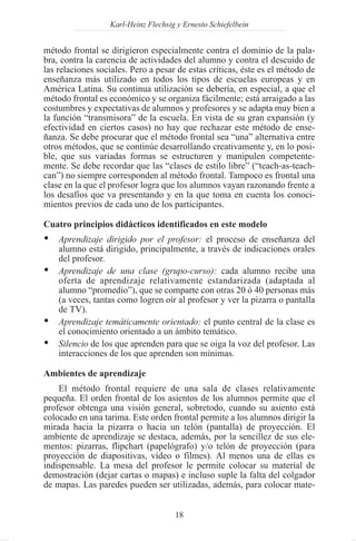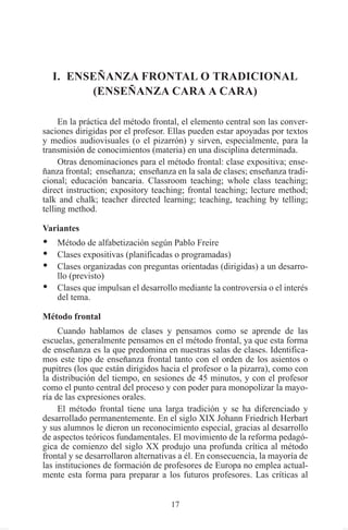 El documento describe el método de enseñanza frontal o tradicional, en el que el profesor transmite conocimientos a los estudiantes de forma directa. Se explican las características del método como la interacción dirigida por el profesor, el aprendizaje de una clase completa y el enfoque en la transmisión de contenidos. También se mencionan algunas críticas a este método como la falta de participación de los estudiantes y la limitación para desarrollar competencias.