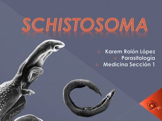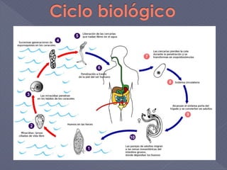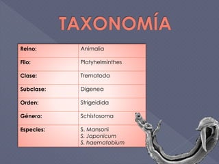 El documento proporciona información sobre el género Schistosoma, que incluye especies de trematodos parásitos responsables de la esquistosomiasis en humanos. Se describen características morfológicas de los gusanos, sus ciclos de vida, modos de transmisión, síntomas y complicaciones asociadas a la infección. También se abordan métodos de diagnóstico, tratamiento y medidas preventivas para controlar la enfermedad.