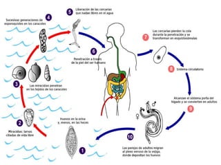 Este documento presenta información sobre Schistosoma haematobium, un parásito que causa esquistosomiasis urinaria. Describe su clasificación taxonómica, el ciclo de vida, la morfología de sus diferentes etapas, los síntomas que provoca en humanos y su diagnóstico. También aborda su epidemiología y las normas aplicables a productos de la pesca para prevenir su transmisión.