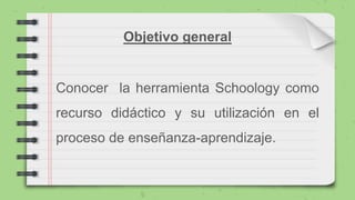 Schoology es una plataforma en la nube que permite a docentes crear, administrar y compartir contenidos y recursos educativos con estudiantes. Ofrece herramientas para gestionar cursos de manera virtual como tareas, exámenes, archivos y comunicación. Tiene ventajas como facilitar la comunicación fuera de clase y hacer seguimiento del trabajo de los estudiantes, pero también desventajas como romper el vínculo afectivo entre docentes y estudiantes.