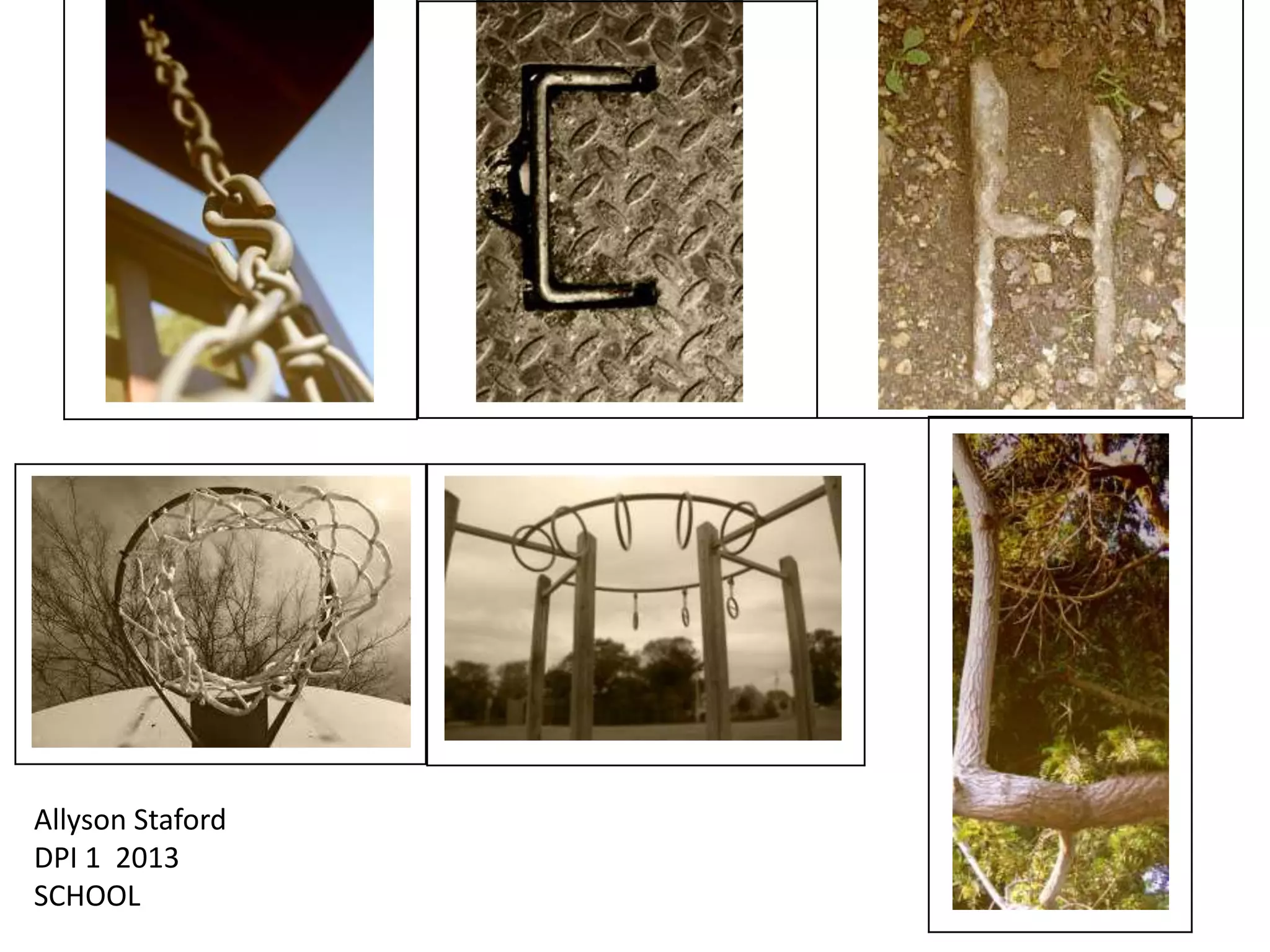 El documento contiene repetidamente el nombre Allyson Staford, DPI 1, 2013 y las letras de la palabra "SCHOOL" una por una en líneas separadas, lo que sugiere que el documento está formando la palabra "SCHOOL" a través de la repetición de la información de identificación y las letras individuales.