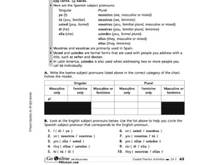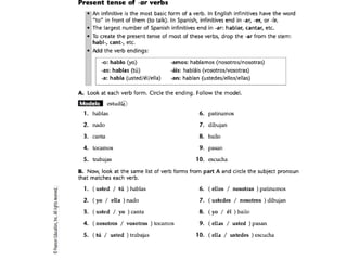 El documento habla sobre el horario escolar de un estudiante. Explica las clases y asignaturas que toma el estudiante durante el día, incluyendo tecnología, arte, ciencias sociales y más. También proporciona información sobre los pronombres personales, la conjugación de verbos en -ar, y preguntas sobre el horario y asignaturas de los estudiantes. Finalmente, da instrucciones para una actividad adicional en un sitio web.