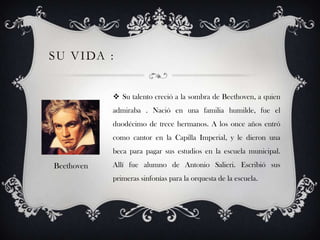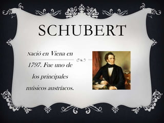 Franz Schubert nació en Viena en 1797 y fue uno de los principales músicos austríacos. A pesar de provenir de una familia humilde, demostró un gran talento musical desde una edad temprana y compuso numerosas obras maestras como lieder y sinfonías siendo aún joven. Sin embargo, nunca logró vivir de su música durante su vida y falleció prematuramente a los 31 años, aunque sus obras pronto ganaron gran reconocimiento.
