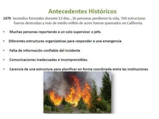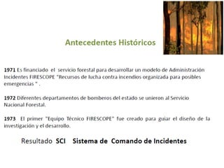 El documento describe el Sistema de Comando de Incidentes (SCI), un modelo organizacional para coordinar de manera efectiva los recursos durante una operación de emergencia. El SCI busca establecer una terminología y estructura común para que diferentes agencias trabajen de forma unificada. Incluye funciones clave, instalaciones, categorías de recursos y la implementación flexible del sistema según el tipo y escala del incidente.