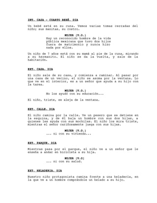 El documento es un guión para un anuncio político. Narra la historia de un niño que ve a otros padres ayudando y cuidando de sus hijos mientras él no recibe ese apoyo de su padre, un hombre público mexicano que tuvo hijos fuera del matrimonio pero nunca los ayudó. Al final, Josefina Vázquez Mota habla sobre la responsabilidad de los padres para con sus hijos y promete proteger a los niños.