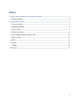 Este documento describe las herramientas de curación de contenido Scoop.it! y Paper.li. Explica que Scoop.it! permite crear páginas llamadas "topics" para organizar contenido sobre un tema. Los usuarios pueden seguir topics de otros y añadir "scoops" o publicaciones a sus propios topics. Paper.li genera periódicos con noticias de redes sociales sobre temas seleccionados. El documento se enfoca en explicar cómo usar Scoop.it!, incluyendo cómo crear una cuenta, topics, añadir scoops, y