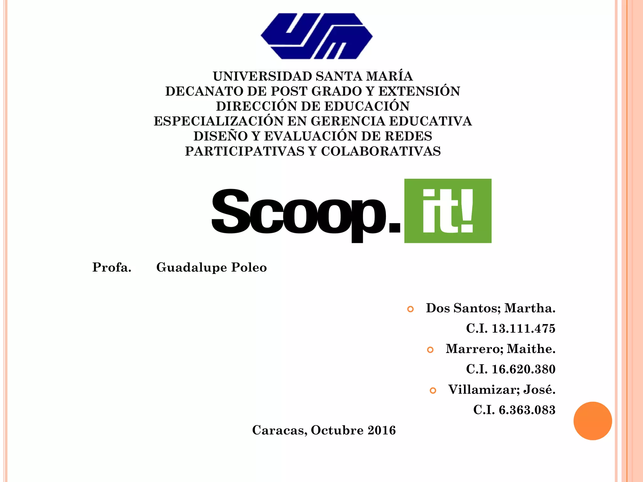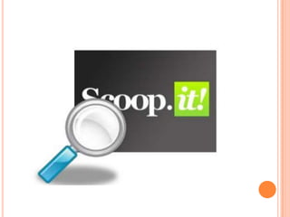 Este documento proporciona una guía sobre cómo usar la plataforma Scoop.it para curar y compartir contenidos de manera gratuita. Explica los pasos para registrarse, crear una cuenta, servicios disponibles como páginas temáticas y grupos. También destaca su potencial para la educación, como mostrar recursos por tema y trabajos de estudiantes. Resalta ventajas como la integración con páginas web y herramientas de análisis, aunque señala limitaciones como la versión gratuita y falta de aplicación