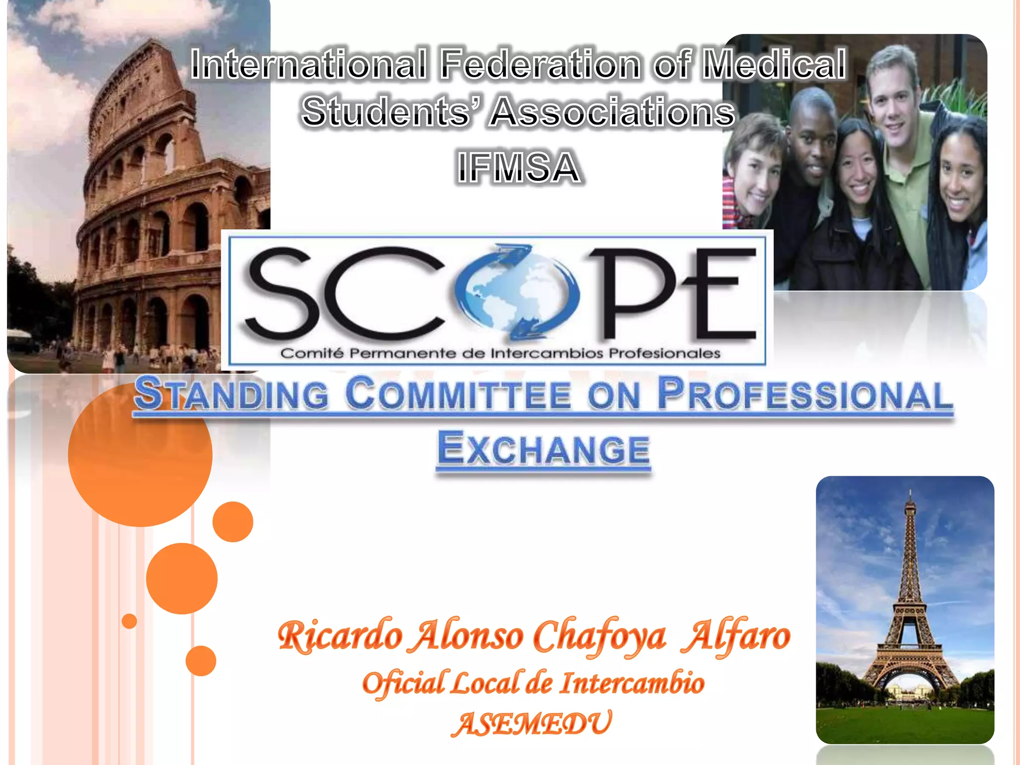 La Federación Internacional de Asociaciones de Estudiantes de Medicina (IFMSA) es una organización que agrupa a estudiantes de medicina de 95 países. Representa a más de 10 millones de estudiantes y ofrece oportunidades de intercambio estudiantil internacional y proyectos de salud pública. El comité SCOPE de IFMSA se encarga específicamente de promover el conocimiento internacional y la cooperación a través de intercambios estudiantiles médicos. El comité local SCOPE de ASEMEDU, la asociación de estudiantes de medic