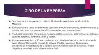 Scorpion es una empresa mayorista con más de 26 años de experiencia. Para mejorar la productividad y reducir errores, decidió implementar la tecnología de voz Vocollect. Esto incrementó la productividad en 27% y la exactitud en el surtido al 99.4%. Los riesgos incluían una mala migración al nuevo sistema y la resistencia al cambio de los empleados. El éxito dependió de la capacitación y apertura al cambio por parte de todos.